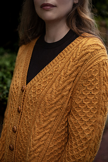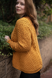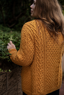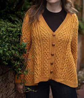 Richly textured cables and honeycomb stitches cover this cozy cardigan, creating a fabric that feels as intricate as it looks. Vertical cable panels frame repeating honeycomb motifs, while shaped wedges along the sides add subtle flare and ease to the silhouette. The result is a cardigan with both structure and movement, balancing texture and form.