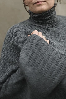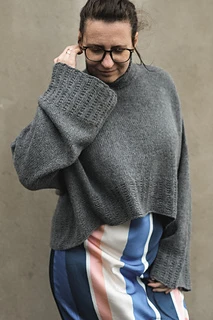 THE BERGAMO SWEATER is a short front and long back length style knit. It has a turtleneck and long wide sleeves. This sweater has a neckline and is worked top-down in Stockinette stitch pattern. In the yoke first part back is worked flat using increases M1L and M1R. In the second part front is worked. After that body is worked in rounds. Neck, cuffs and hem are worked in Pearl Rib stitch pattern. The sweater body is worked straight, therefore it can be easily made longer and of course, more yarns should be estimated. BERGAMO SWEATER is a fashionable knit, that fits well for those who like to wear uncommon clothes.