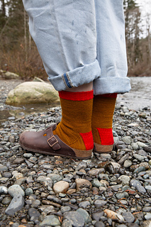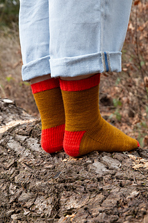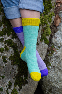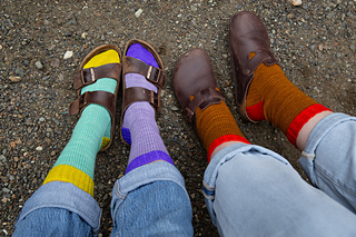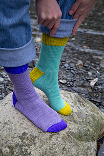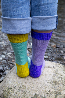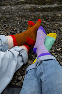 Samples shown in Magpie Fibers Swanky Sock in Tupelo Extra and Iconic Orange Lady and Tanis Fiber Arts Purewash DK in Lilac with Grape and Mint with Goldenrod.