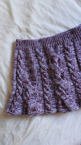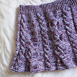 Beyond Cables Skirt is worked top down with a mix of smaller and larger cables. You cast on for the ribbed waistband and then continue to work the skirt in the cable pattern while you shape it with increases. At the bottom of the skirt you make additional increases to give the skirt a slight bell shape. There are different alternatives for if you want to make the skirt longer and/or more flared. Lastly you finish off the skirt with a few garter rounds before you bind off.