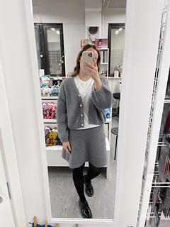 Mallineuleet on neulottu Biches & Buches Le Petit Lambswool -langan sävyssä Soft pink grey sekä Biches & Buches Le Petit Silk & Mohair -langan sävyssä Rose grey (vaaleanpunainen) sekä Biches & Buches Le Petit Lambswool -langan sävyssä Medium grey sekä Biches & Buches Le Petit Silk & Mohair -langan sävyssä Medium grey. Kuvissa hameet on kuvattu 170 cm mallin päällä helman mitan hahmottamiseksi.