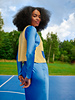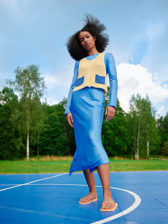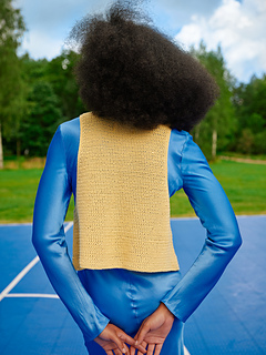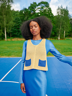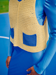 The top is crocheted from the shoulders down to the hem in rows using single crochet. The front panels are worked separately and joined with a visible seam on the right side. Two pockets are crocheted onto the front. The back panel is worked as one piece and attached to the front panels with single crochet seams – also left visible on the outside. A narrow edging is added to the armholes, neckline and hem to give the light structure a crisp, finished look.