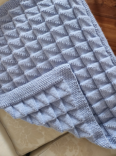 Whether knitting for a new arrival or someone who can use the extra bit of warmth a lap throw brings, this pattern is just the ticket: a very easy diagonal split-box design that is totally reversible.