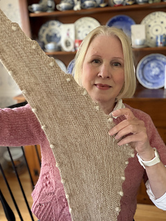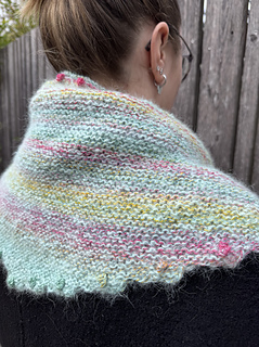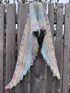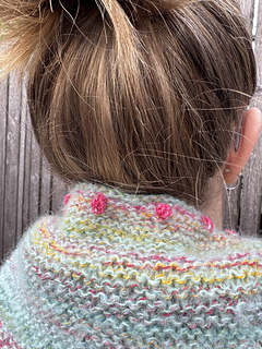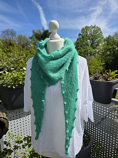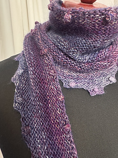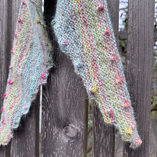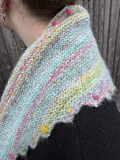 „BOBBLE BANDANA“ is a very beginner-friendly „knit-stitches-only“ pattern, there are no purl stitches. There are increases at both sides every few rows which make the wingspan grow fast. The increases make a nice zig-zag-edge when wearing. Every little “increase step” has a tiny bobble in its middle.