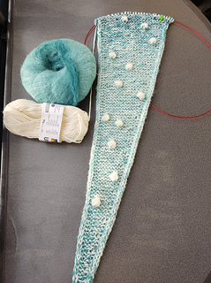 Ich habe ein super weiches Suri Alpaka gewählt und doppelt genommen – zusätzlich zu einem selbst-streifenden Garn, das für die Farbe und den Strickspaß sorgt. Die Bobbles werden nur mit dem selbst-streifenden Garn gestrickt, was die vielen Farben dieses Garns gut wirken lässt. Ein Knäuel Edition 3 (150 m) und ein Strang Dufte lace (300 m doppelt verstrickt) wurden komplett aufgebraucht.