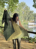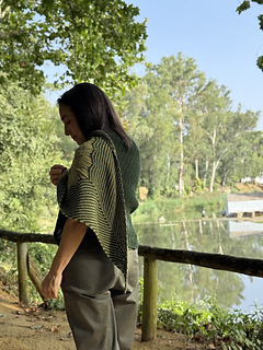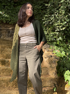 En el modelo de la fotografía hemos usado 3 madejas de LALANALÚ Nadir (100% lana merina española hecha de manera sostenible, 380m = 100g), una en color pistacho (verde claro) y dos en musgo (verde oscuro).