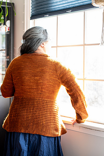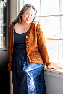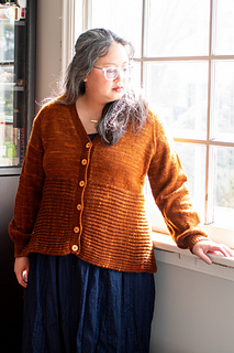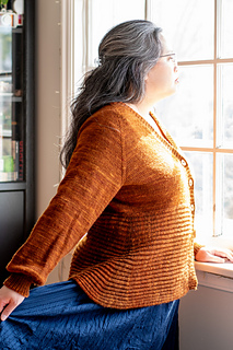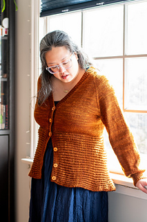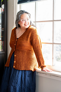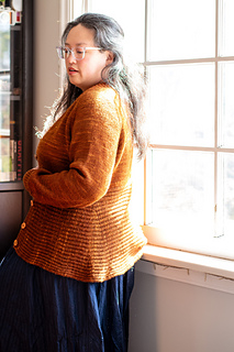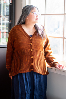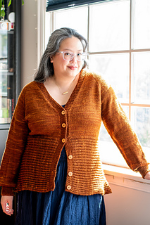 Bostock is a seamless cardigan, worked from the top down with a deep V-neck and waist decreases. The lower body is cast on and worked perpendicularly to the upper body in Brioche stitch. The Brioche section is shaped with short row gores at the sides of the body, creating a flared silhouette. Long sleeves are worked in the round with decreases and a fitted cuff.