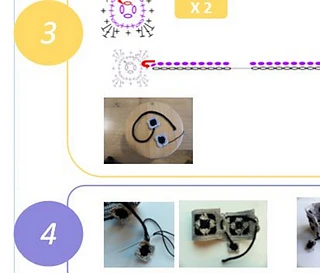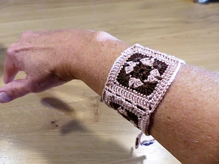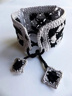 A bracelet made up of several “Granny” squares, the number of which may vary according to the size of the yarn used. It can be made into a rather classic bracelet with sober colours or a more colourful piece of jewellery with bright colours. The proposed attachment system does not contain any metal or plastic parts that could injure the skin or cause allergies. It also allows the bracelet to be adapted to all wrist sizes. The realization of the bracelet is quite easy, it is the regularity of the work that is the most important. The PDF tutorial includes a main diagram and 2 detailed diagram as well as a step-by-step explanation with 17 photos.