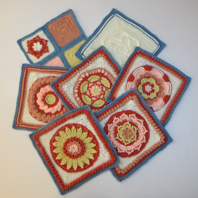 Briony has a centre and frame of popcorns, with two circles of pretty petals, this easy, fun square can be made with as many or few colours as you like.
