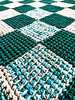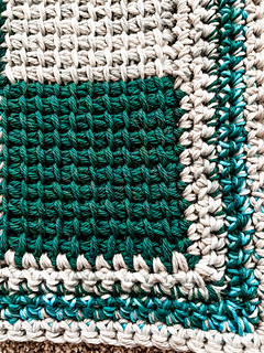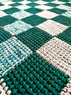 I used Swish Tones for the variegated colors (which I held double with a dove gray color). And I used a dark green color for solid squares for a very modern yet rustic look.