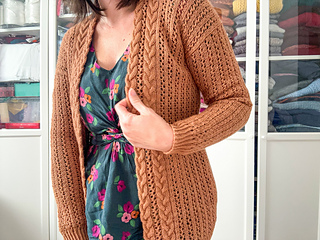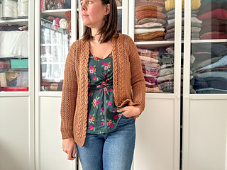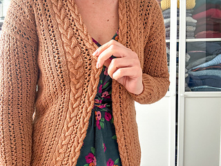 Burnt Toffee is a cardigan designed to be worn open (but you can use a shawl pick to close it).