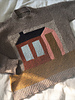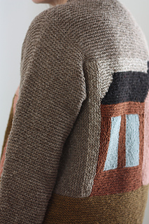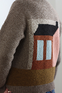 There is a small section of charted intarsia on the block with the roof and chimney. The rest of the motif is made using log cabin knitting techniques, it is all small sections of garter stitch that is worked with 1 color.