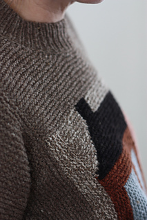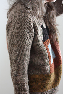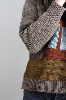 The Cabin Pullover is worked modularly from the center out using Log Cabin techniques. First you make the Center Front then the Center Back. Next join the shoulders, finish the neck band then pick up stitches along the sides to work to the desired width. The sides are joined with a 3-Needle bind off and the sleeves are worked down in the round. Then stitches are picked up around and the body is worked down in the round to the desired length.