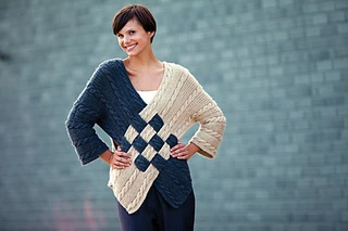 A modern silhouette mixes with graphic color for a truly unique knit. The cable lover will feel inspired to make something that is definitely a conversation-starter.