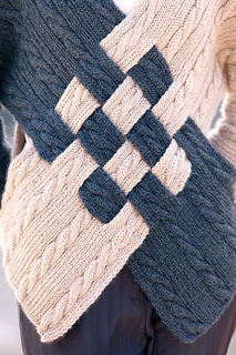 Sweater is color-blocked with cabled strips woven to form sweater front.