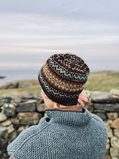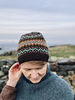 This hat is worked from the brim to the crown, beginning with a ribbed brim. Fair Isle charts are then worked for the body of the hat through the crown decreases. An optional pom-pom can be added.