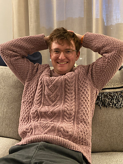 This classic Aran is the men’s version of the Cambridge pullover, with traditional cable stitches paired with varied stitch patterns. Some cables have been modified from the women’s version for a more masculine look and so they can be worked a bit faster. It has minimal shaping and is worked flat, from the bottom up. With a comfortable fit, this is perfect for an heirloom sweater that will last years and years.