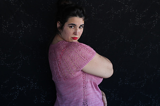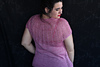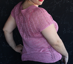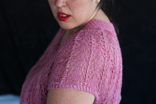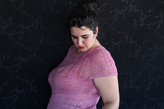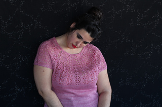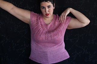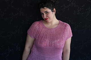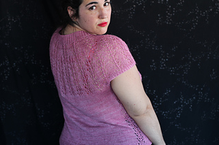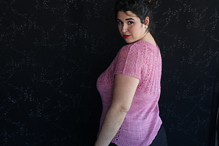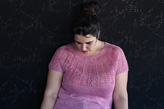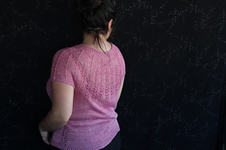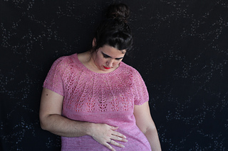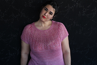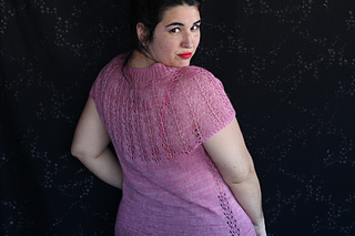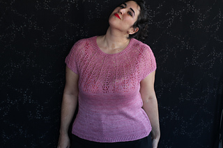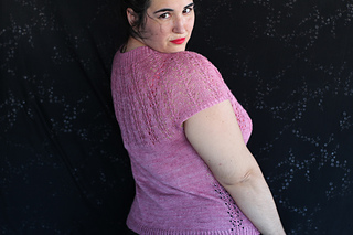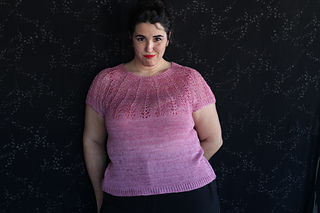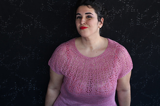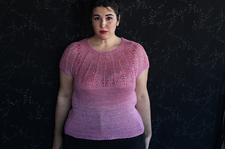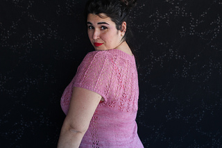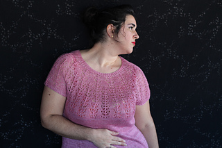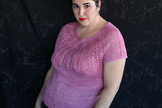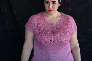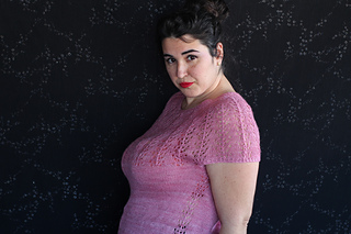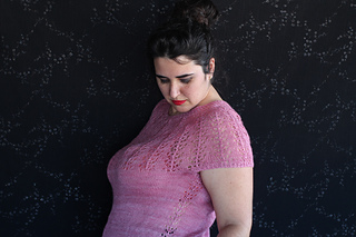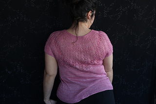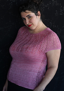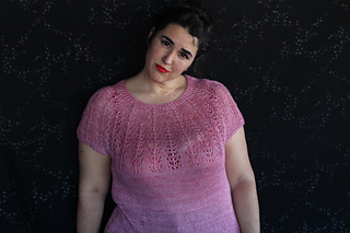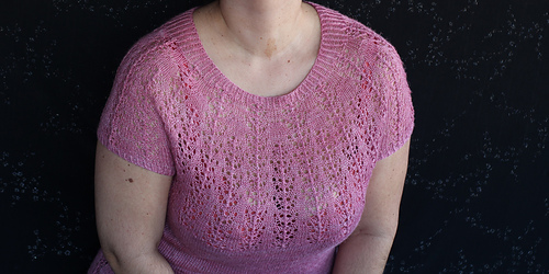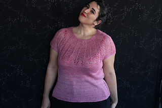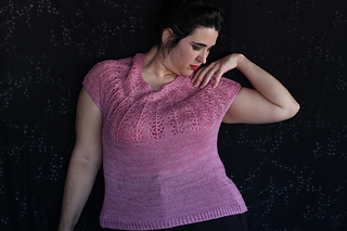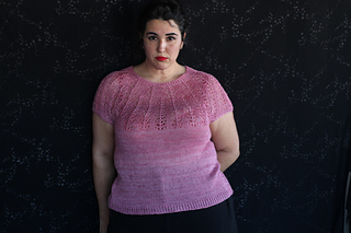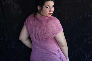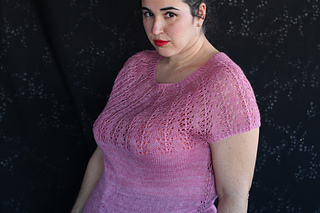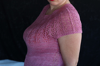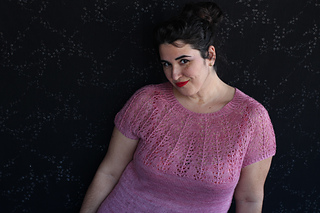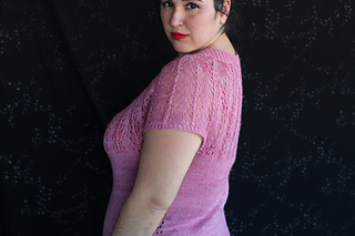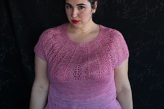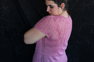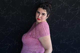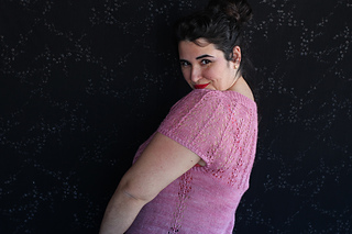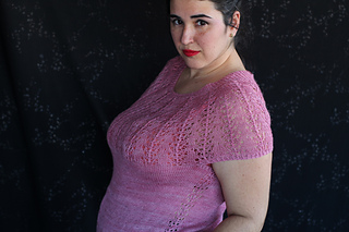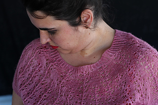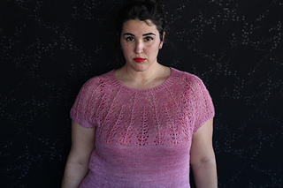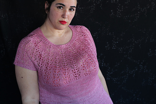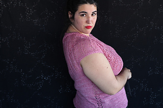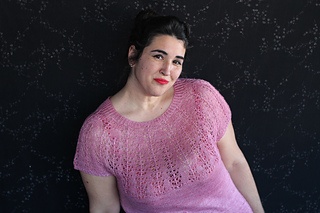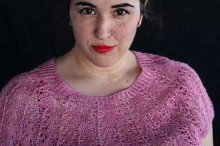Este patrón tiene un montaje top-down de arriba-abajo sin costuras, tejido circular. El cuello se hace con un elástico retorcido, las vueltas cortas del cuello forman parte del mismo elástico. Después tiene un canesú con un motivo de calados y el cuerpo tiene una separación bajo las sisas con el motivo calado. Las terminaciones son con cierre italiano en el bajo y las mangas tras un elástico.