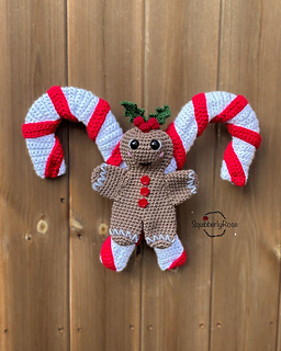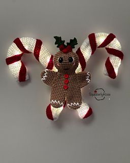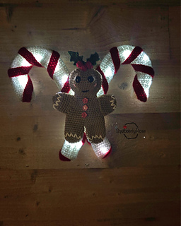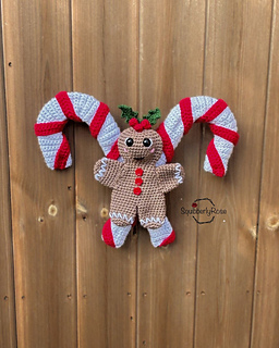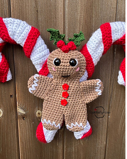 Brighten up your holiday Season with this crocheted light-up candy cane wreath featuring an adorable gingerbread man.