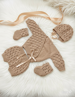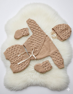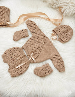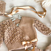 This pattern provides the instructions to make the crossover cardigan, shorts, bonnet, and little boots.