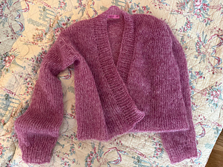 Die Mohair-Jacke „MARISOUL“ wird von oben nach unten zweifädig gestrickt, dadurch gibt es keine Nähte, die zusammengefügt werden müssen. Die Ärmel werden aus den Randmaschen herausgestrickt, ebenso die V-Schrägung, die unten mit 2 Knöpfen geschlossen werden kann.