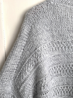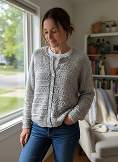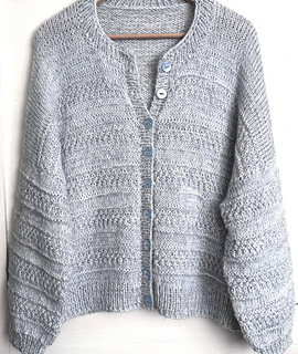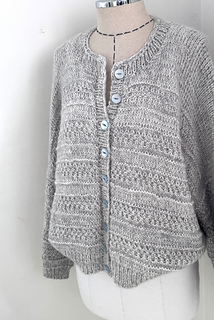 The garment is worked seamless from the top down with slanted European shoulders using short row shaping, worked flat to underarm then body is joined and finished. The sleeve stitches are picked up around the opening and worked in the round. The garment is finished with a neat button band.