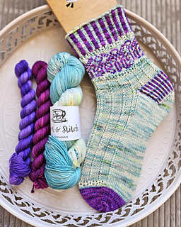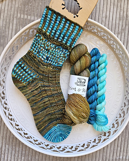 The Carved Wood socks are a cuff-down pattern with stranded knitting on the cuff, using a semi-solid to slightly speckled main color and two solid contrasting colors. I used colors reminiscent of the life cycle of copper: brown-green to teal to aqua blue.