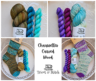 Carved Wood (bois gravé) est un modèle de chaussettes tricotées de la bordure vers le bas, avec la bordure en jacquard à fils tirés, et utilise comme le coloris principal, une laine faux-unie à légèrement tachetée (speckled) et deux coloris contrastants unis. J’ai utilisé des couleurs évoquant l’évolution du cuivre pour la première version: vert brun à vert canard, puis bleu turquoise.