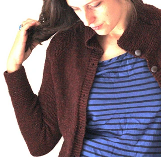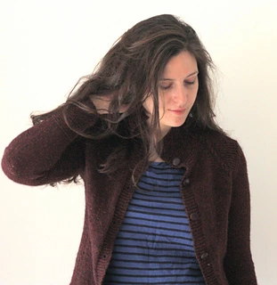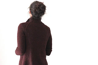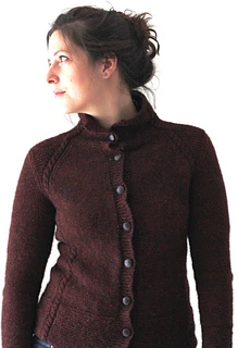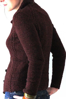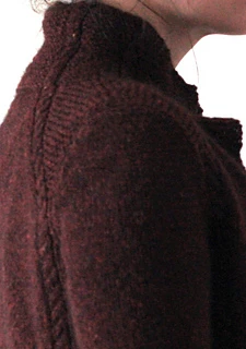 This is a fitted cardigan with sewn set-in sleeves and is knit from the bottom up. Mirrored 2-over-2 cables begin in the edging and are worked through to the collar where the cable adds a just enough stability to keep the collar standing though this will depend on the choice of yarn (think wool and cotton or blends there of). The shoulder faux raglans, are worked in garter stitch to match the edging, front bands and collar.
