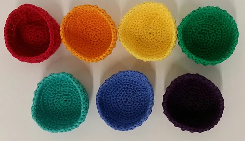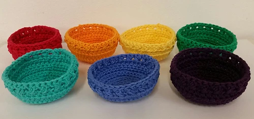 The bowl size can be varied by adjusting hook size, yarns and number of strands used.