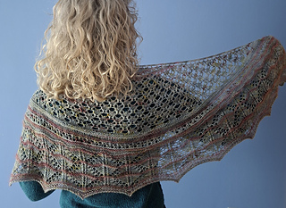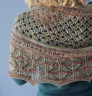 Lacería es un chal ligero y vaporoso con forma de media luna (crescent shawl en inglés) pensado para cuando en verano necesitas echarte algo sobre los hombros no demasiado grueso. El original está tejido con agujas de 4 mm y una sola madeja de grosor fingering de 440 metros de la calidad Leicester, de Cazuelana (Alpacana), en el color Stonehenge y lleva muchos calados para que la sensación sea de ligereza. Su nombre se debe a que su calado final recuerda a la lacería de estilo almohade que adorna la Giralda de Sevilla, ya que se diseñó expresamente para el festival Sevilla Teje en su edición de 2024.
