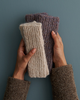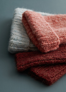 - 1 (1, 2) ball(s) of Purl Soho’s Pouf, 50% alpaca and 50% Andean highland wool. Each ball of this super bulky-weight yarn is 108 yards/ 100 grams; approximately 75 (100, 125) total yards required. We used Pink Bisque, Pearl Blue, and Twig Brown.