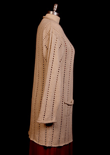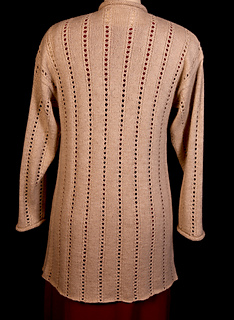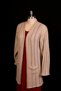 I love long cardigans and I’ve designed a fair number, but this may be my favorite. The construction is very simple, with minimal shaping. The stitch pattern is easily memorized, so why have I graded it Intermediate? The answer is Pockets. I ripped out the first pocket three (!!!) times, and I have used this pocket construction many times. I think the fineness of the yarn may have contributed to the difficulties, but I have included several Designer Notes to help others avoid making the same mistakes. If you omit the pockets, I would grade this design as Basic although the length requires patience.