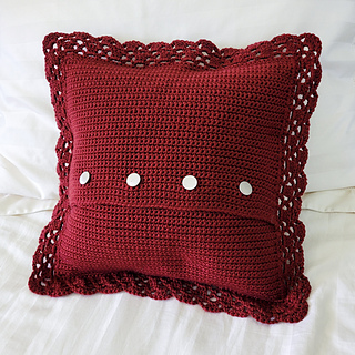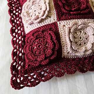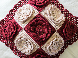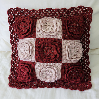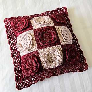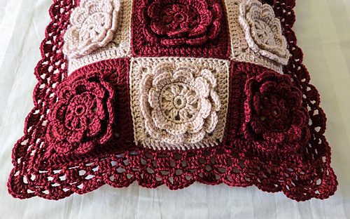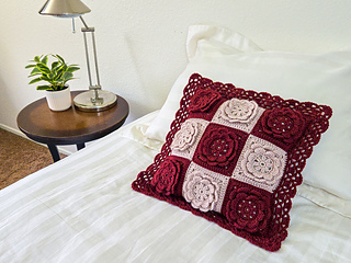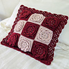 The rose squares used in this pillow are a fresh take on the traditional Irish rose crochet motif. By working the petals in the front loops only and the following rounds in the back loops, the design achieves both a layered, dimensional look and a sturdy, cozy fabric. Choose from two techniques (invisible mattress stitch or back loop slip stitch) to join motifs in a checkerboard design. Two panels, worked in sturdy single crochet stitches, overlap at the back and fasten with buttons, making this pillow cover easy to remove for cleaning.