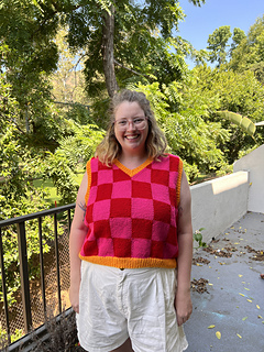Checkered Vest is – you guessed it! – a sweater vest featuring a bold checkered motif. Intarsia is used to create the large checkers, and the vest is knit flat and seamed so that the intarsia can be worked flat. The intarsia method also means that you can add as many colors as you want in each row without adding any extra complexity – so you could easily adapt this to make a scrappy patchwork version! I worked the back panel in a single color, but checkers can easily be added to the back as well if you prefer.