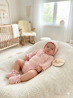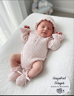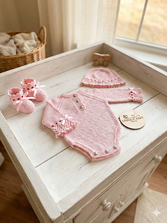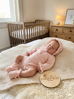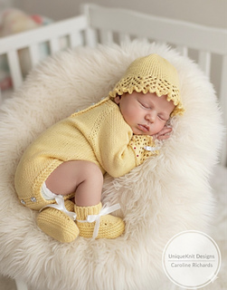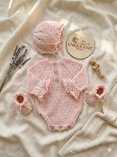 A beautiful 3 piece Romper set knitted with a simple textured stitch and lacey cuffs . The romper is knitted from the top down with buttons to the front and crutch.