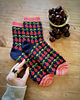 Knit from the top down with a couple of contrasting stripes on the ribbed cuff, these socks have a short row heel (with a video tutorial too!) and a stranded colourwork pattern throughout the leg and foot. The toe decreases with a couple of stripes to match the cuff and is finished by grafting stitches together. This pattern uses the magic loop circular needle method (but can be knit with 23cm (9 inch) circulars or DPNs).