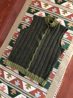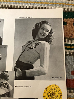 This is a pattern for a button-up sweater in two colors with eight buttons. It is made in pieces and sewn together. The sizes are 1940s sizes. The bust measurements range from 28-34 inches.