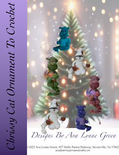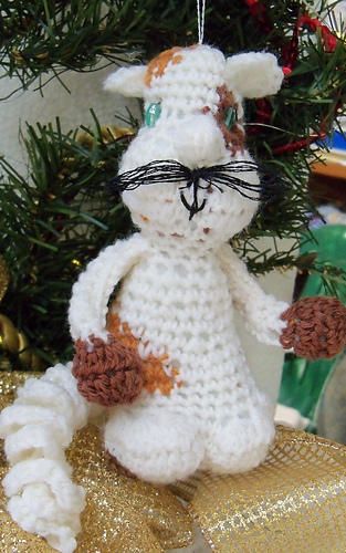 Chrissy Cat is a cute crocheted ornament worked out of fingering (sock) weight yarn. It can be worked in one color or with several colors. It’s a good way to use up stash yarns or mini-skeins.