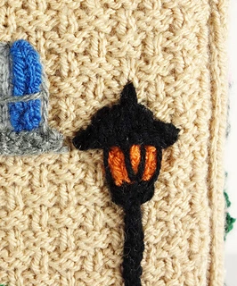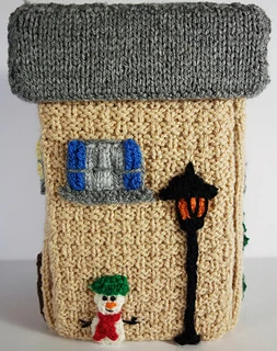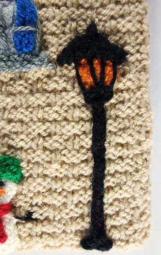 This Victorian street light stand against the same side wall as the snowman and is simple to knit. You will need 3.25 mm double pointed needles for this pattern as the post is worked in I cord.