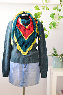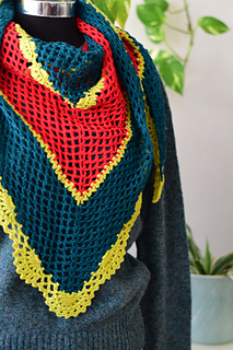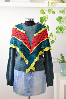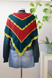 This lightweight triangular shawl is easy to crochet and fun to wear. Bold stripes and airy mesh make it a colorful, breezy accessory that works well with any outfit.
