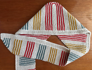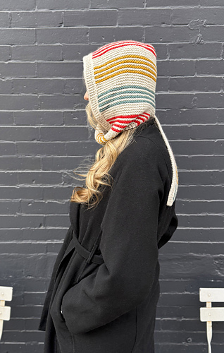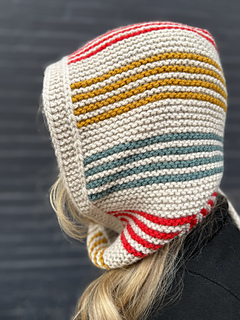 a simple intarsia technique. The hood shape is formed with increases and decreases, then seamed at the back of the head.