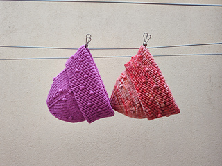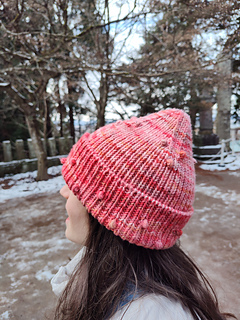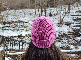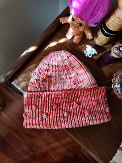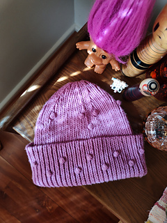 CIRCUS is knit bottom-up, in the round, in one piece. The entire piece is worked in 1x1 rib, with small bobbles on the folded brim and near the crown. Bobbles are worked on the right side; as such, after working the brim, you will turn your work so that the wrong side becomes the right side, and vice versa.