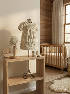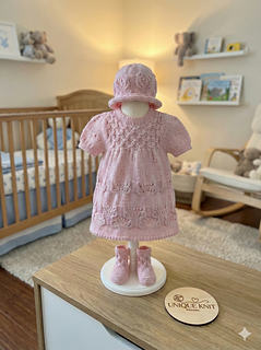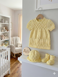 The dress is knitted from the bottom up in one piece to the armholes, which helps reduce the amount of sewing required. The sleeves are knitted separately.