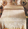 Filet bedspread with cameo panels on top and garland of flowers around sides.