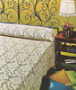 SHown with scroll headboard, lime green, blue, and brown pillows on the floor.