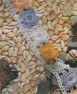 Colored flower motifs attached to white base. Flowers have 4 raised petals and four flat petals, and surround with picots.