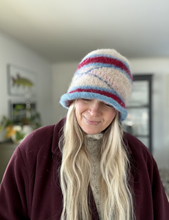 - Burgundy hat with a blue stripe: 4 (4) 5 5 (5) 6 balls of Sandnes Garn Fritidsgarn (70 m / 80 yds / 50 g, 100 % wool), knitted holding two strands of yarn together, in colorway 4529 Prune red AND 1 (1) 1 ball of Sandnes Garn Fritidsgarn (70 m / 80 yds / 50 g, 100 % wool), knitted holding two strands of yarn together, in colorway 6573 Light blue
