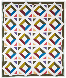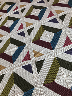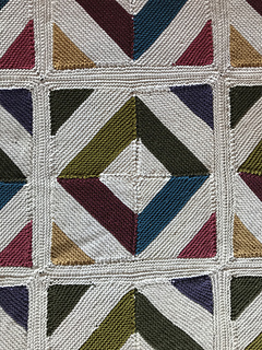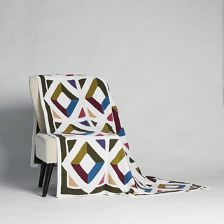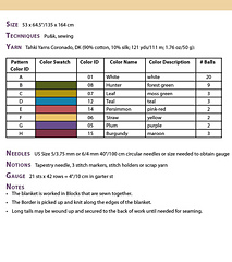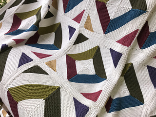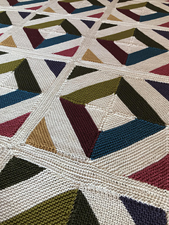 The blanket is worked in 20 squares that are sewn together. Simple decreases and color changes (stripes) are used to create the shapes.