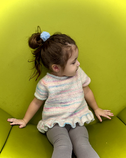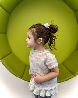 Classic raglan shaping keeps the construction approachable, while the sweet bell ruffle hem adds movement and personality. Knit in the round from the neckline down, this pattern allows you to easily customize length and skip the ruffle for a simple rolled hem if desired.